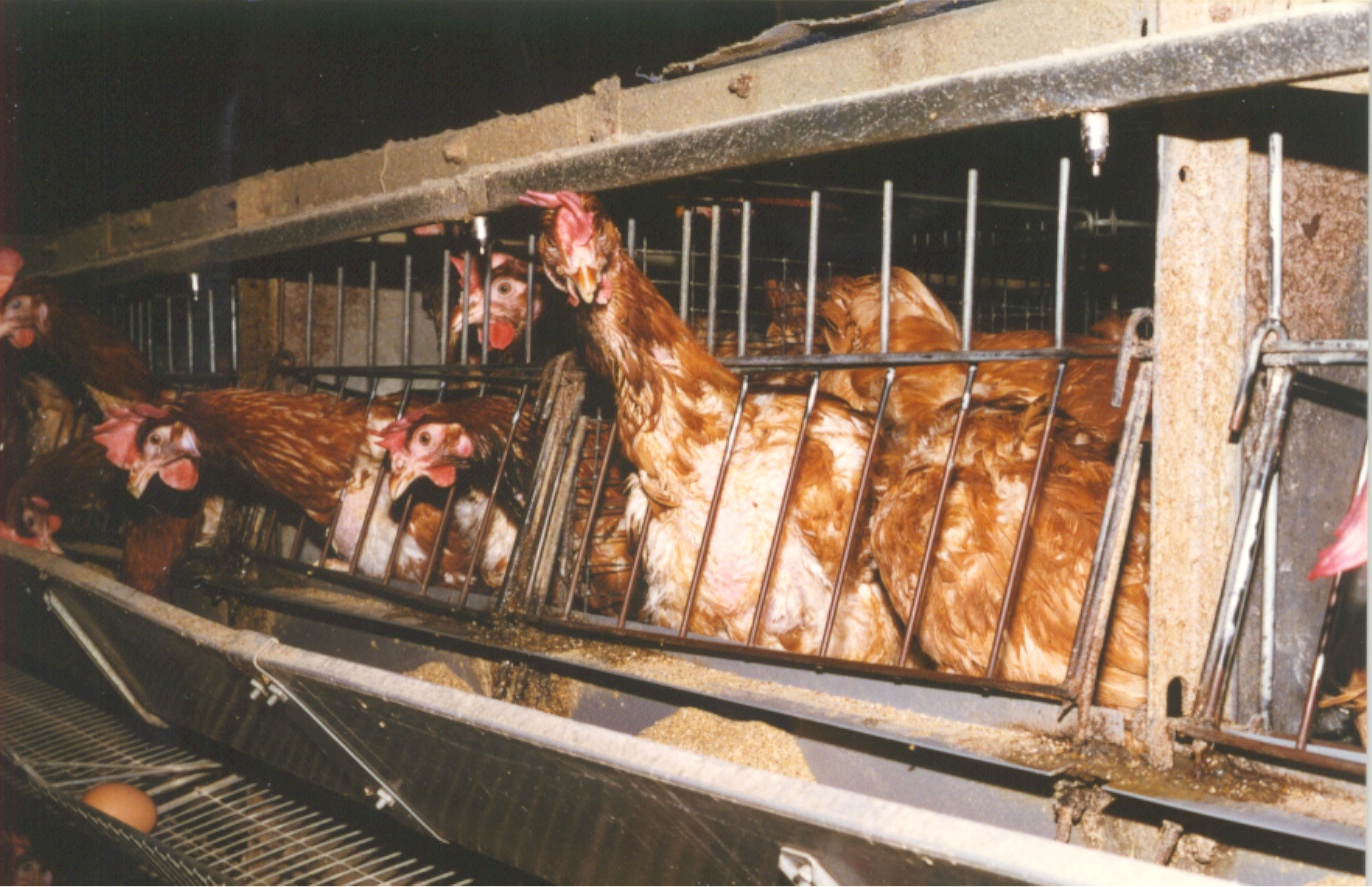 Les visites des cages en batterie nous ont donné une idée du sort de ces malheureuses poules. Enfermés dans de petites cages, coupés du monde extérieur dans des bâtiments où la lumière du jour ne pénètre jamais, ils mènent une vie aussi courte que misérable. Sans liberté de mouvement et empilés les uns sur les autres, ils ont comme horizon un couloir faiblement éclairé entre deux rangées de cages. Ces poulets, qui ne peuvent pas bouger dans les cages, développent des os plus faibles et même des fractures. A la fin de cette horrible vie, quand vient le temps de se rendre à l'abattoir, des équipes spéciales vident rapidement les cages, attrapant quatre à cinq poulets dans chaque main, la tête baissée. De cette façon, les poulets souffrent de luxations de la hanche et parfois leur tête reste coincée dans le couvercle des cages ou ils meurent par étouffement parmi leurs compagnons de souffrance.