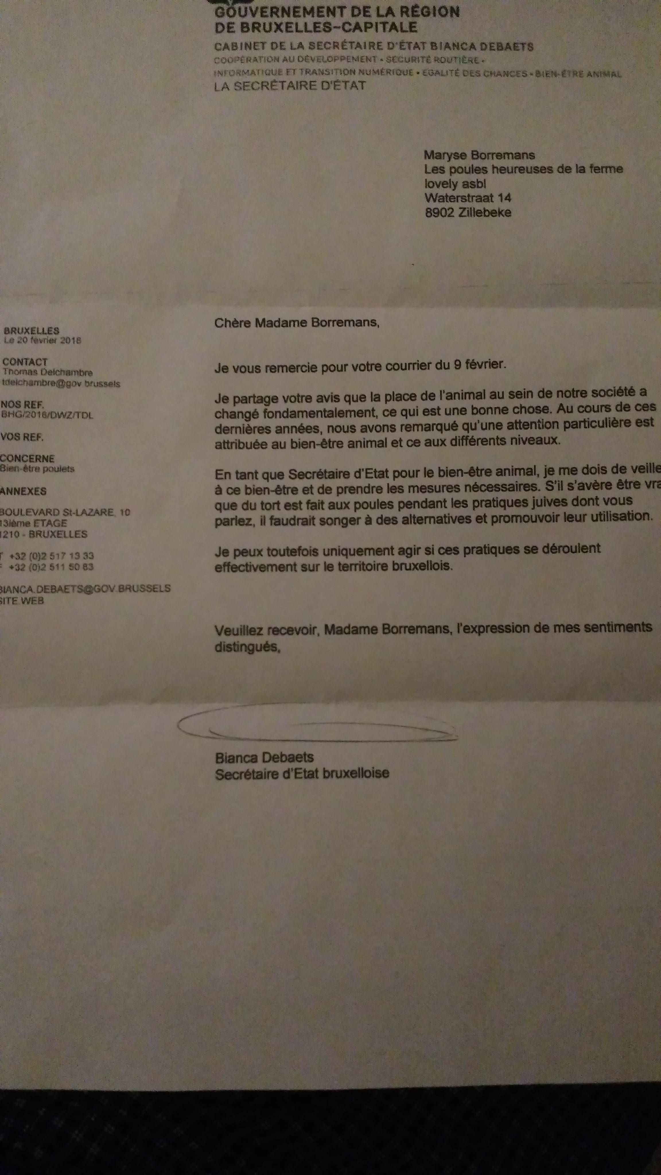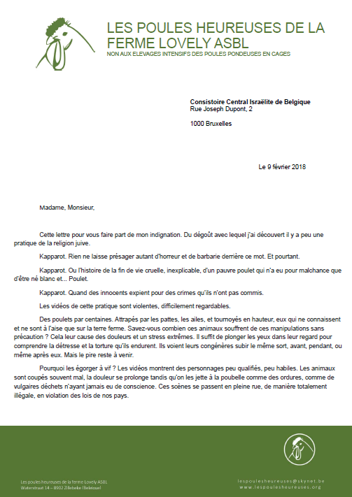 Voici la lettre envoyée en février 2018 par notre association à: Congrégation Israëlite Sépharade D'Uccle-Forest; Communauté Israëlite de Bruxelles; Communauté Israëlite Sépharade de Bruxelles; Communauté Israëlite Orthodoxe; Communauté Israëlite D’Uccle- Forest; Communauté Israélite Libérale de Belgique ; Communauté israélite de Bruxelles; Synagogue Beth Midrach; Communauté israélite Sépharade de Bruxelles; Communauté israélite de Waterloo; Synagogue Beth Israel; Ambassade et consulat d'Israël; Consistoire central israélite de Bruxelles; Oratoire de l'Aéroport Bruxelles National ; Synagogue Beit Ytzhak; Synagogue Habad; Synagogue Or-Ha'yim; Oratoire de Molenbeek ; Congrégation Sépharade d'Uccle; Ministre Bien-être animal wallon; Ministre Bien-être animal Bruxellois; Ministre Bien-être animal Flamand; Service qualité bien être animal.