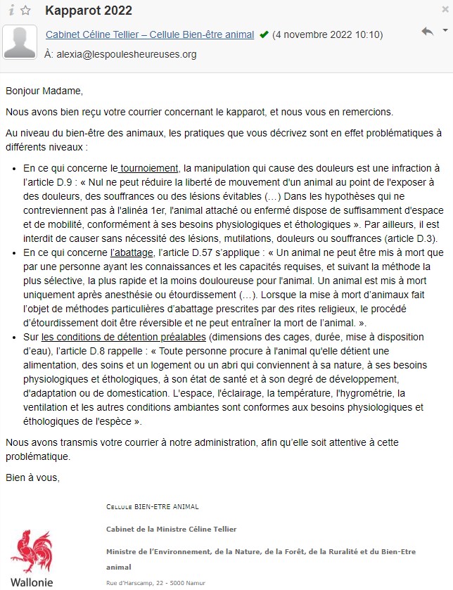 Nous souhaitons que cette cérémonie religieuse ne soit plus réalisée avec des animaux mais avec de l’argent, puisque la pratique l’autorise, et vous demandons à tous, y compris au Grand Rabbin de Belgique, d’encourager votre communauté à respecter la législation nationale qui interdit la mise à mort d’animaux en dehors des abattoirs.