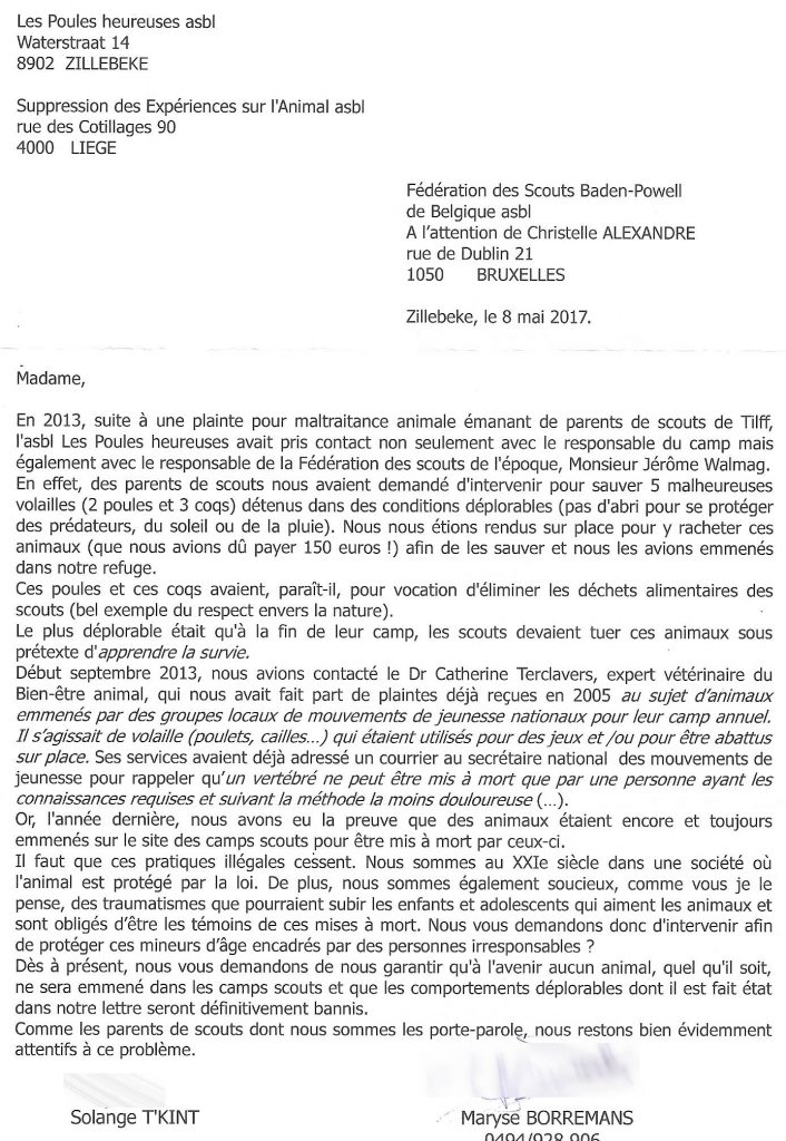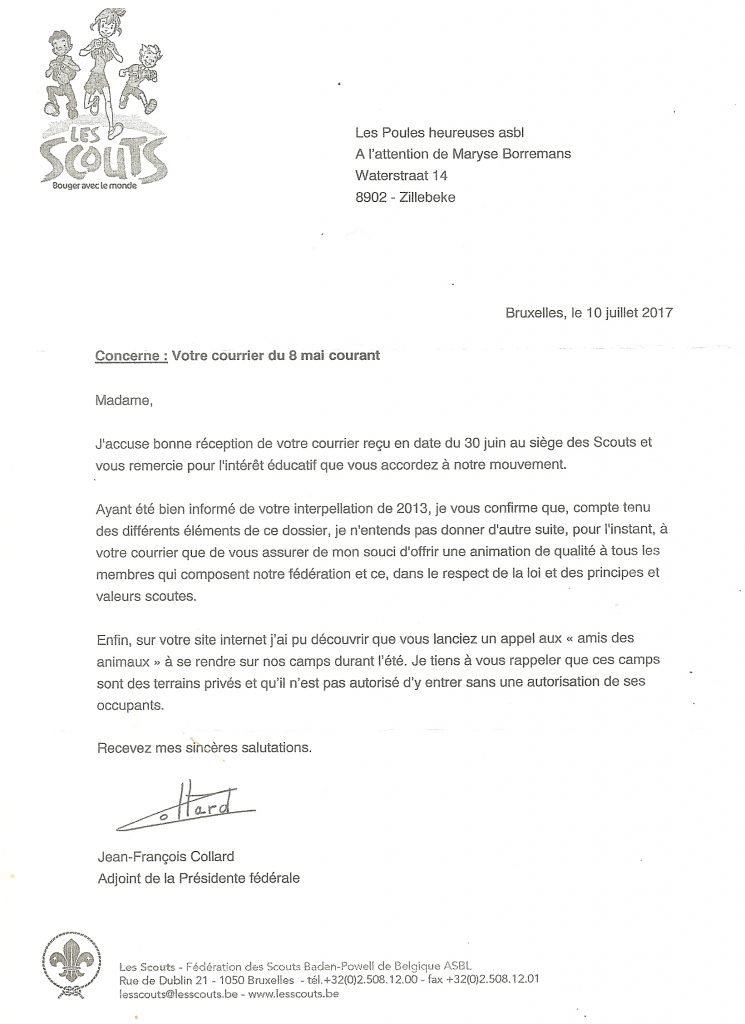Cette année, nous avons à nouveau envoyé un courrier à la responsable des scouts afin de lui demander de mettre fin à ces infractions au bien-être animal.