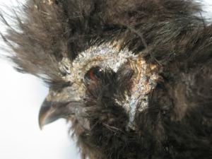 Peau mise à nu (souvent au niveau du cou, le dessous du corps, les ailes).