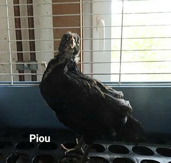 Piou est un poussin arrivé à l'âge de deux semaines. Nous ne savons pas encore si c'est un coq ou une poule. Pour le moment Piou reste à l'intérieur avec nous, il est trop petit, et l'hiver est à nos portes. Il /elle ne pourra donc sortir qu'au printemps.