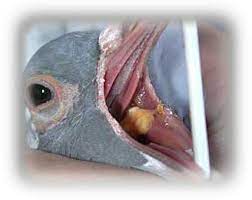 Le trichomonas aviaire est une maladie causée par le protozoaire Trichomonas Gallinae. Les gallinacés s’infectent en buvant de l’eau contaminée par les oiseaux sauvages. Symptômes : La présence du parasite dans le jabot, l’œsophage, la bouche, la gorge et les sinus provoque des lésions jaunes qui peuvent grandir et bloquer les conduits. Les oiseaux ne peuvent pas toujours fermer la bouche, et la maladie entraine une dyspnée, une dysphagie et une accumulation de fluide dans la cavité orale. Il y a aussi souvent perte de poids, écoulement oculaire, ataxie et aveuglement. Traitement : Tricho plus (versele laga) minimum 5 jours dans l’eau de boisson (1 sachet par 2 litres) ou Spartrix pour pigeon (comprimés dans le bec)